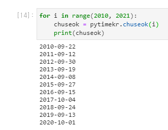 chuseok = pytimekr.chuseok(i)
