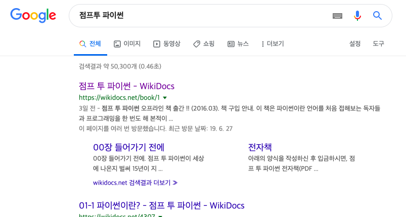1) 위의 링크를 클릭하시거나, 2) 검색창에서 '점프투파이썬'을 검색하시면 사이트를 찾을 수 있습니다.