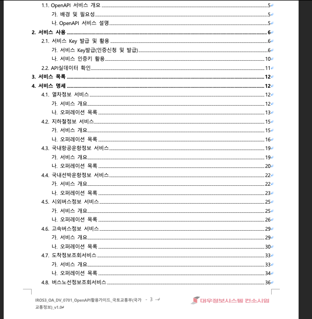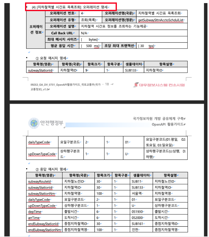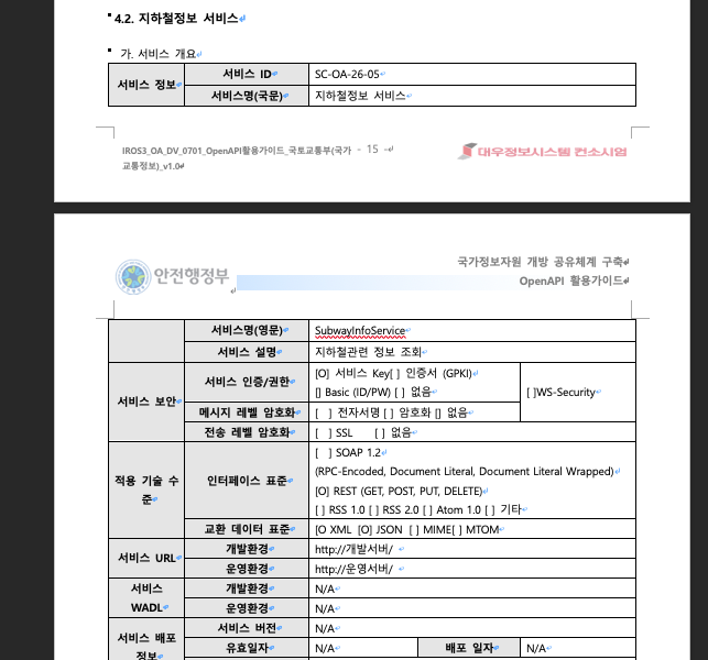 문서의 목차(4.서비스명세)를 보고, 우리가 사용할 서비스인 '4.2 지하철정보 서비스'를 클릭합니다.