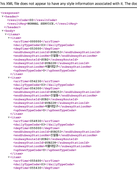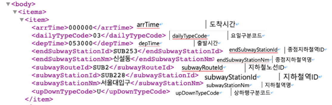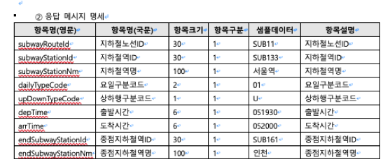 요청변수라는 항목은, SUB228이라는 ID를 가진 지하철역의 일요일(03) 상행(U)의 시간표 목록을 조회하겠다 라고 이해하시면 됩니다.