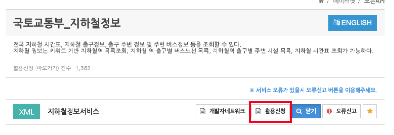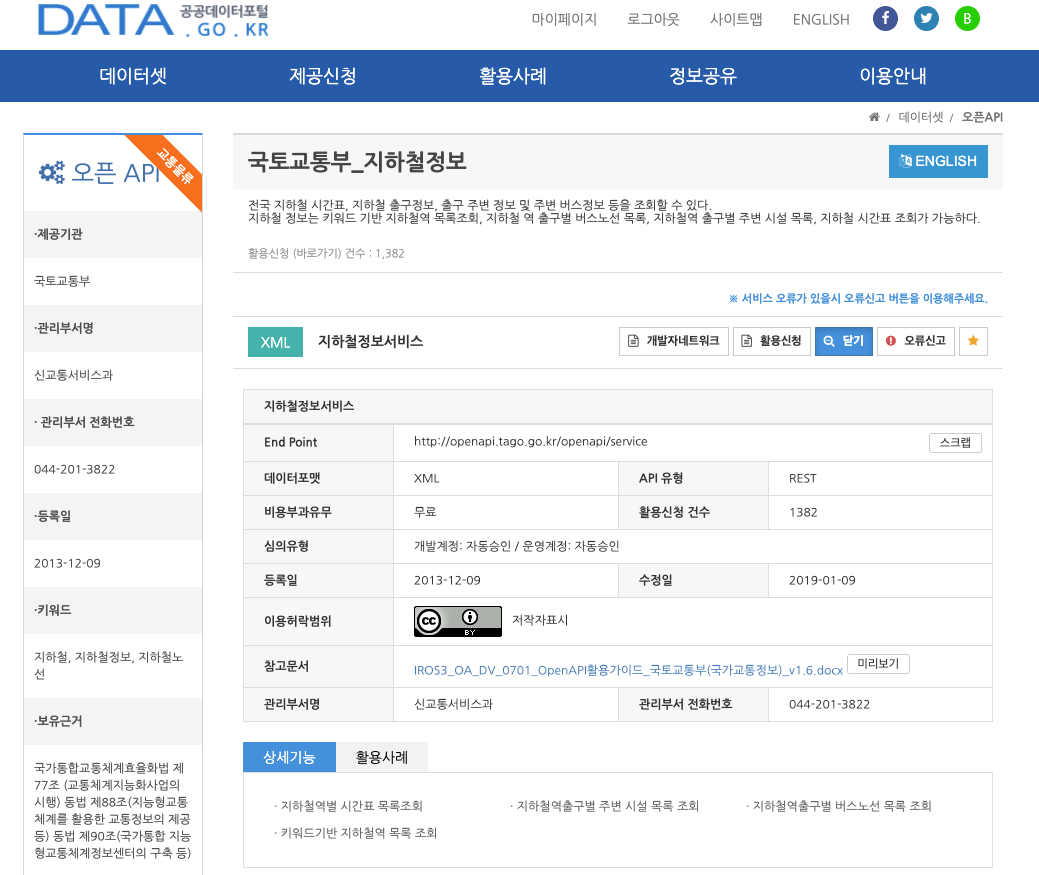 국토교통부_지하철정보를 클릭하면 세부화면이 뜹니다.