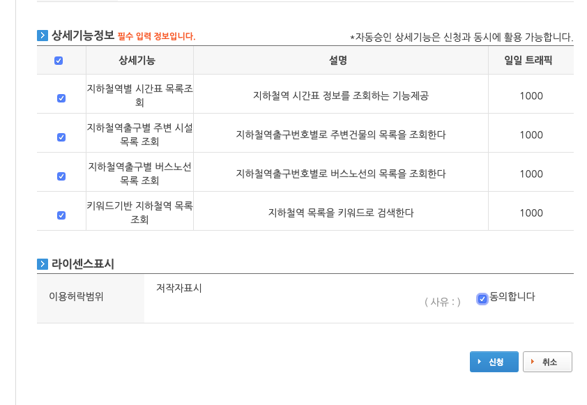 다음으로 페이지 하단의 상세기능정보입니다. 여기서는 사용할 기능을 체크해주시면 되는데, 전체 다 체크해주시는게 편합니다.