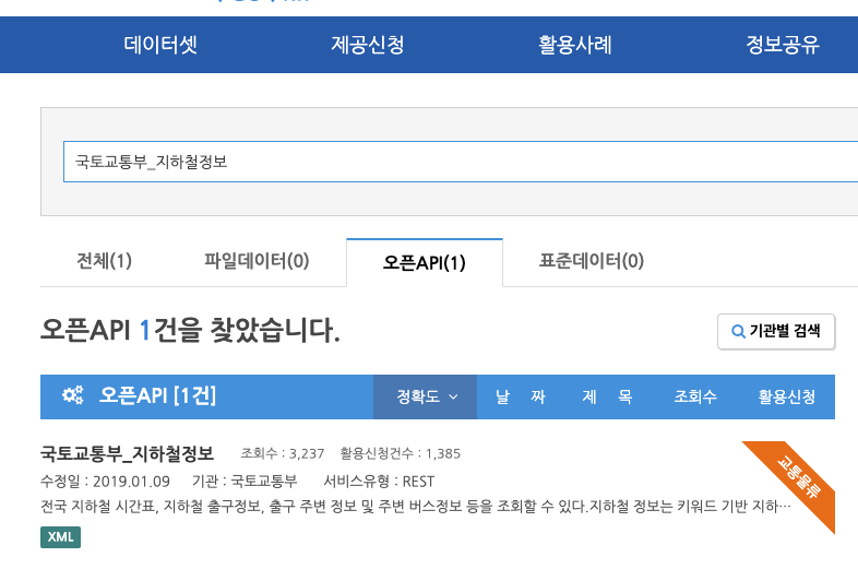 검색창에서 원하는 데이터명을 검색하면 됩니다. 오늘 사용할 데이터는 "국토교통부_지하철정보"
