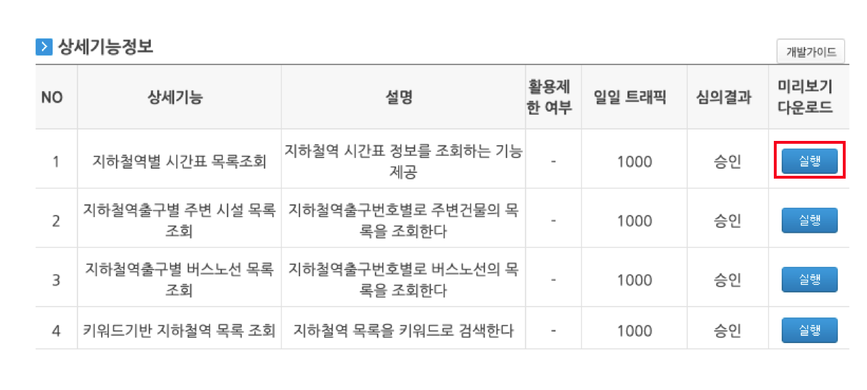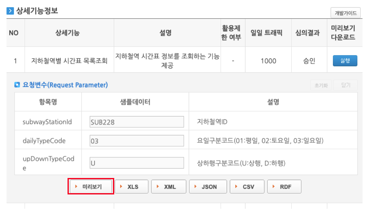 아래를 살펴보니, 해당 api에서 제공하는 기능들이 있습니다. 지하철역별 시간표 목록을 조회하기 위해, 미리보기 다운로드 실행을 클릭해보겠습니다.