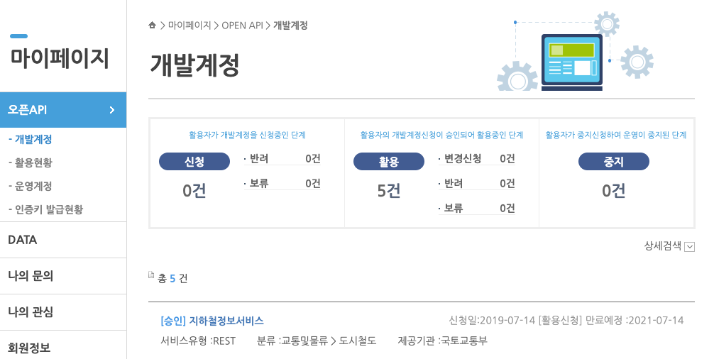신청을 완료하셨으면, 마이페이지-오픈API -개발계정에 들어가서 내가 신청한 결과를 확인할 수 있습니다.