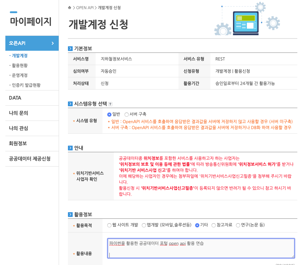 보통 자동승인이 많아서, 데이터 활용신청을 한 후 바로 승인이 나는 경우가 많습니다.