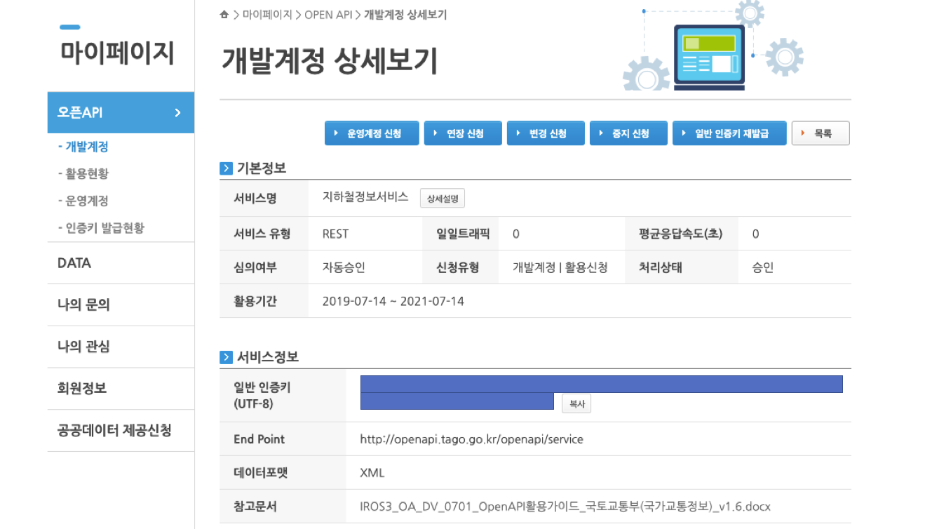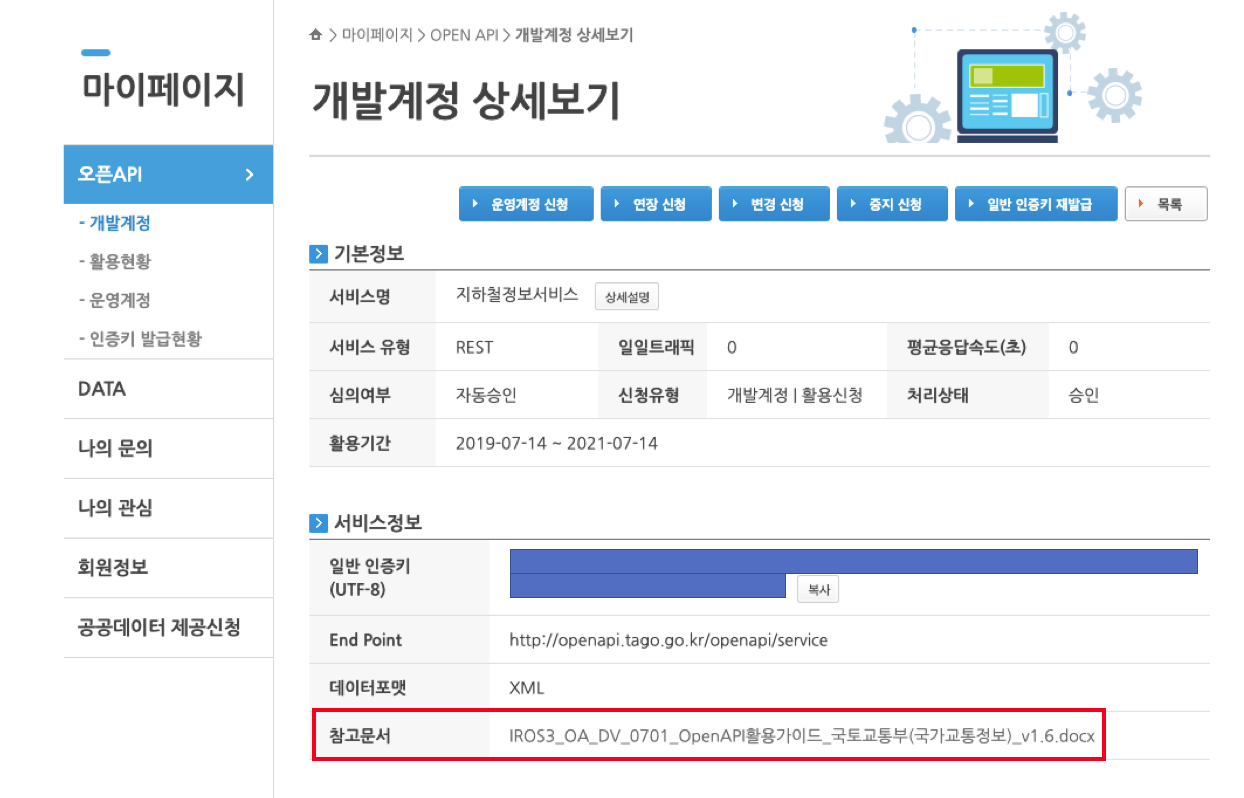 여기까지 문제없이 진행이 되셨다면, 공공api를 활용하기 위한 인증키 발급이 완료된 것입니다. 아래 이미지에서 파란색 막대기로 가려진 부분이 개인별로 발급되는 인증키 부분입니다. 특별한 이유가 없으면 유출되지 않도록 주의합니다. 인증키 별로 하루에 요청할 수 있는 트래픽 제한이 있습니다.