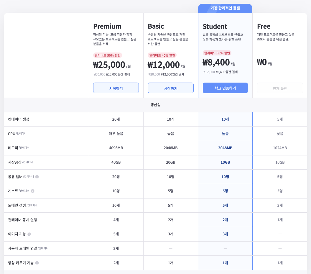 구름IDE 가격정책은 프리미엄, 베이직, 스튜던트, 프리 총 4가지이다