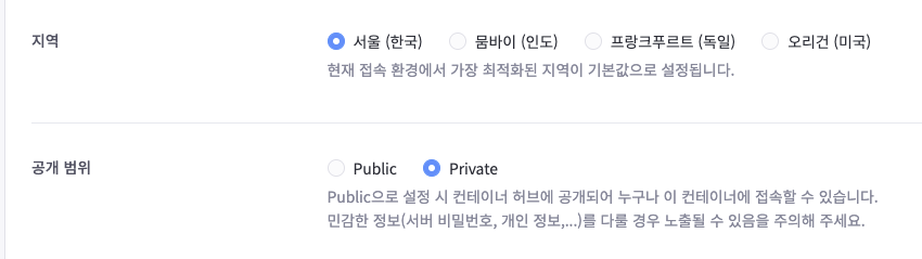 컨테이너를 생성할 때 서울 리전도 설정할 수 있고, 비공개로 세팅이 가능하다
