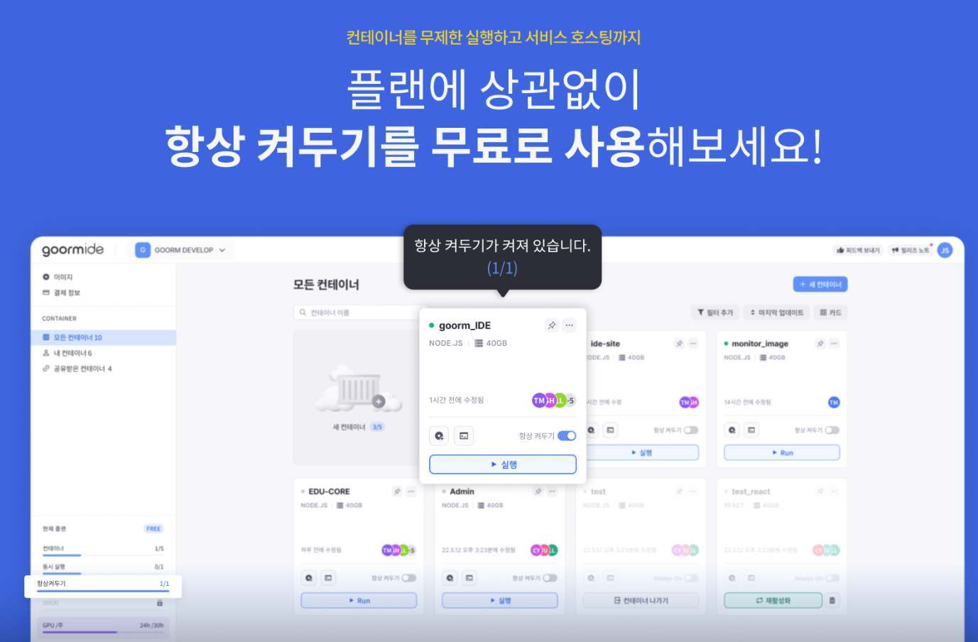 무료플랜은 컨테이너 5개, 메모리 1g, 저장공간 10g, 도메인3개생성, 항상켜두기 1개를 제공한다